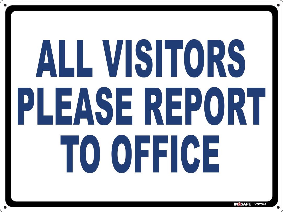 The All Visitors Please Report to Office Sign (400 x 300 PVC) is designed to direct visitors to the office upon arrival, ensuring safety and proper visitor management. This clear and concise sign is ideal for office buildings, commercial spaces, or any facility where visitor check-ins are required.