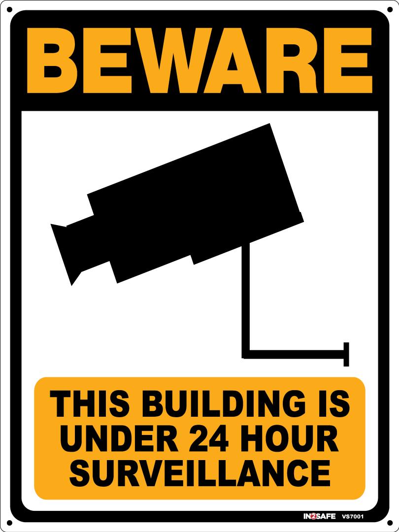 • Bold "Beware This Building Is Under 24 Hour Surveillance" message