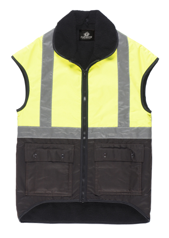 Far South 86FYR Oilskin Vest Yellow/Brown provides the perfect combination of safety, warmth, and durability, ideal for outdoor workers who require reliable performance.