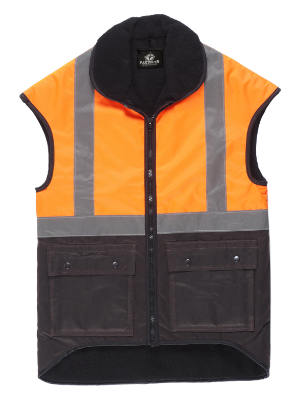 Far South Orange Fluro Top Reflector Oilskin Vest combines durability, warmth, and visibility, ideal for demanding work conditions.
