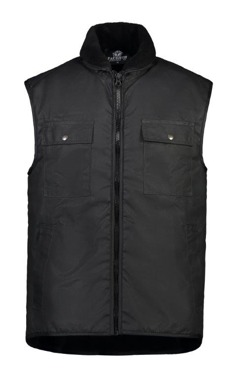 Far South Waikaka Oilskin Sleeveless Vest - Black offers durable oilskin protection with added warmth and practicality for tough conditions.