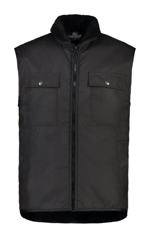 Far South Waikaka Oilskin Sleeveless Vest - Black offers durable oilskin protection with added warmth and practicality for tough conditions.