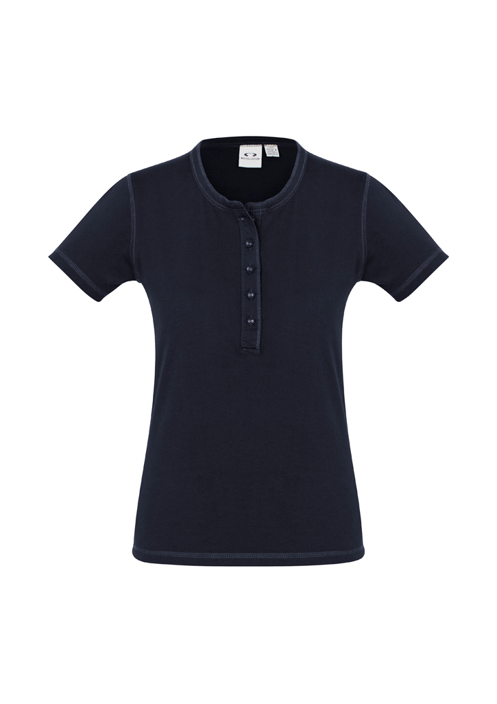 • Henley style placket with fabric-covered fish-eye buttons