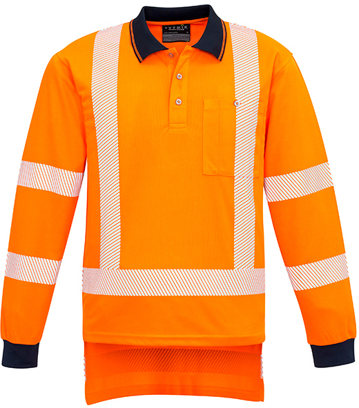 A long-sleeve, high-visibility polo with segmented reflective tape for enhanced visibility and safety, designed for compliance with TTMC-W standards.