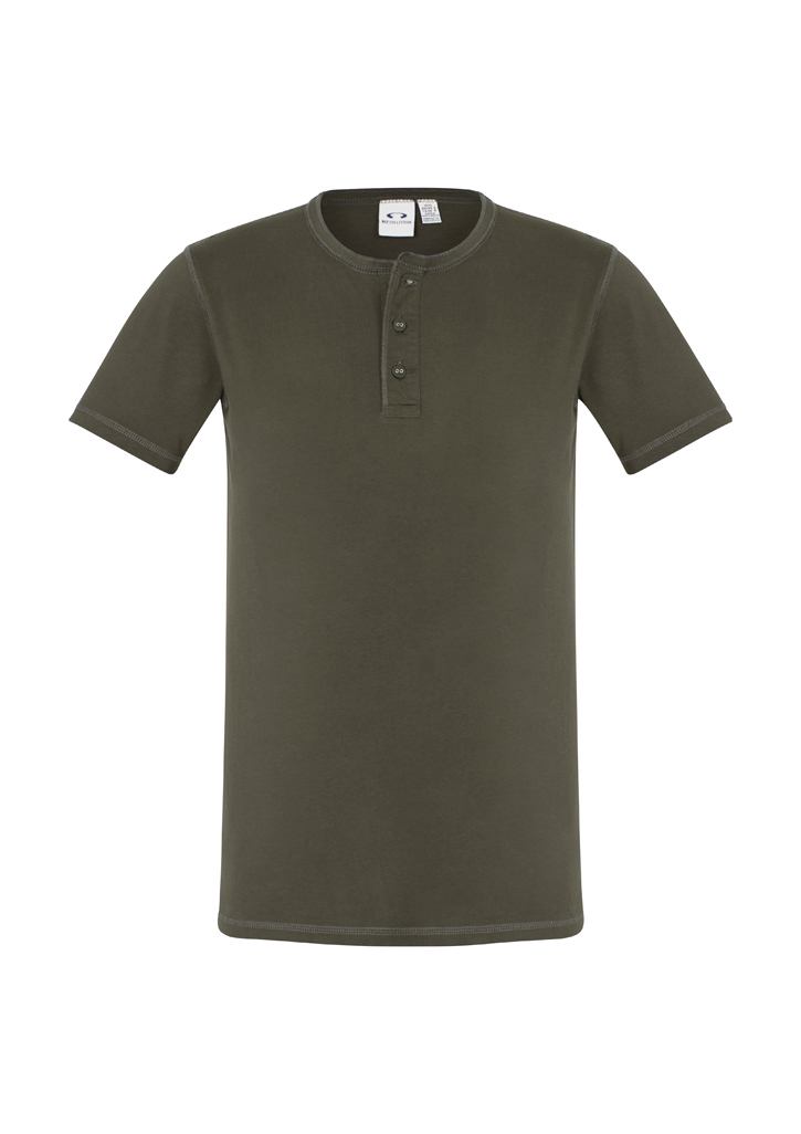 • Features a crew neck with flat-locked stitching and a Henley style placket