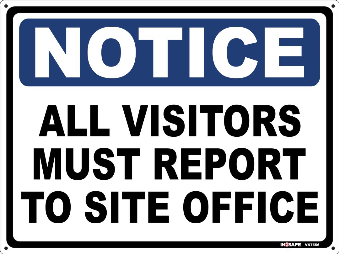 Notice All Visitors Must Report To Site Office Sign 400 X 30Ensure proper visitor protocol with the Notice All Visitors Must Report To Site Office Sign. Made from durable materials, this sign clearly directs visitors to report to the site office, helping maintain site security and order.